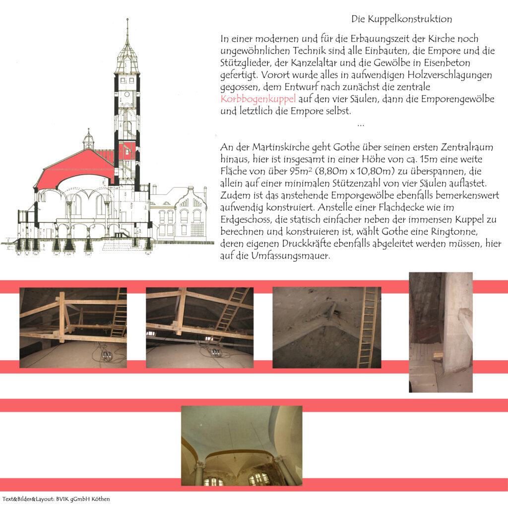 Die 96 Quadratmeter große Rundkuppel der Martinskirche besteht aus Eisenbeton und ruht in 15 Meter Höhe auf vier Säulen – eine damals eindrucksvolle bautechnische Besonderheit. Markant und eigenwillig gestaltet ist die Haube des Chorturms.